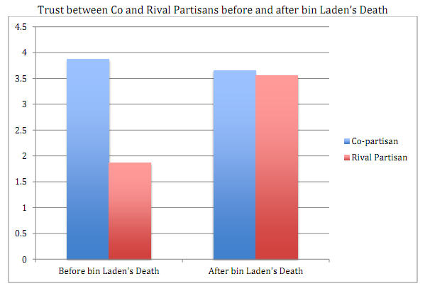 (Before anyone gets too excited about Bin Laden’s lasting effect on restored inter-partisan trust, it’s probably worth noting that the average duration of rally effects is under ten months. And John Sides points out that gains in intragroup trust among Americans might be offset by diminished intergroup trust between Americans and others. All in all, I’m not ready to buy the idea that a stealthed-out Black Hawk is the best tool for building social capital.)